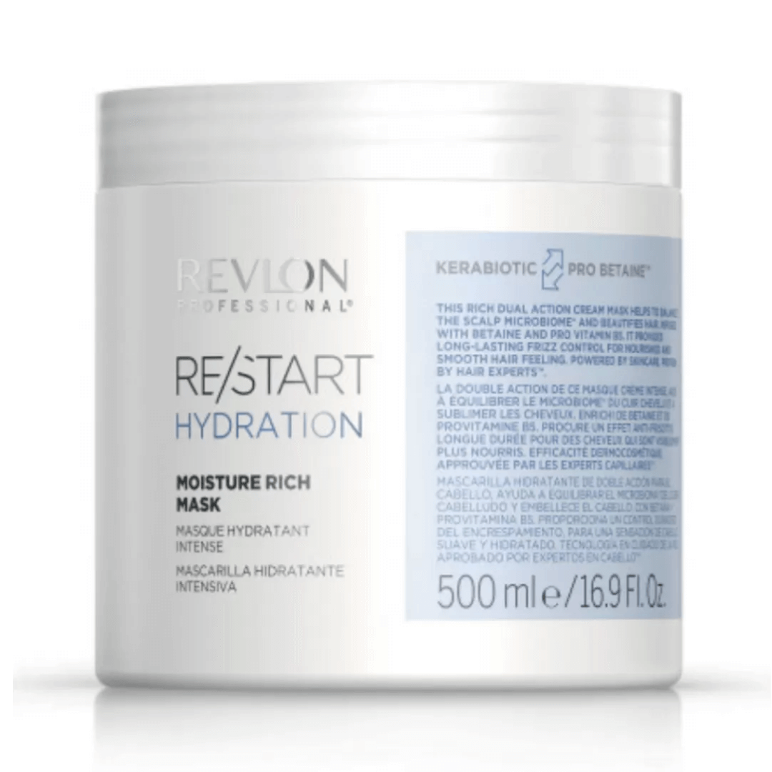 La "Restart Hydration Moisture Rich Mask " di Revlon è una maschera per capelli formulata per idratare e nutrire i capelli secchi e danneggiati.